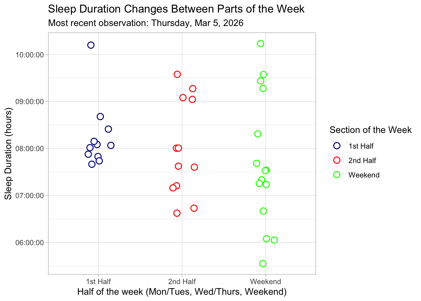 Figure 1: Sleep Duration Changes Between Parts of the Week: This jittered scatterplot illustrates nightly sleep duration (hours) across three sections of the week: 1st Half (Monday–Tuesday), 2nd Half (Wednesday–Thursday), and Weekend (Friday–Sunday). Each point is a white circle with moderate transparency and slight horizontal jitter to show individual observations while minimizing overlap. The points are colored according to blue for 1st Half, red for 2nd Half, and green for Weekend. The plot uses a light theme for a cleaner look, and the subtitle notes the most recent observation recorded on Thursday, March 5th, 2026. The visualization highlights that sleep duration tends to increase slightly toward the weekend, with variability visible within each section.