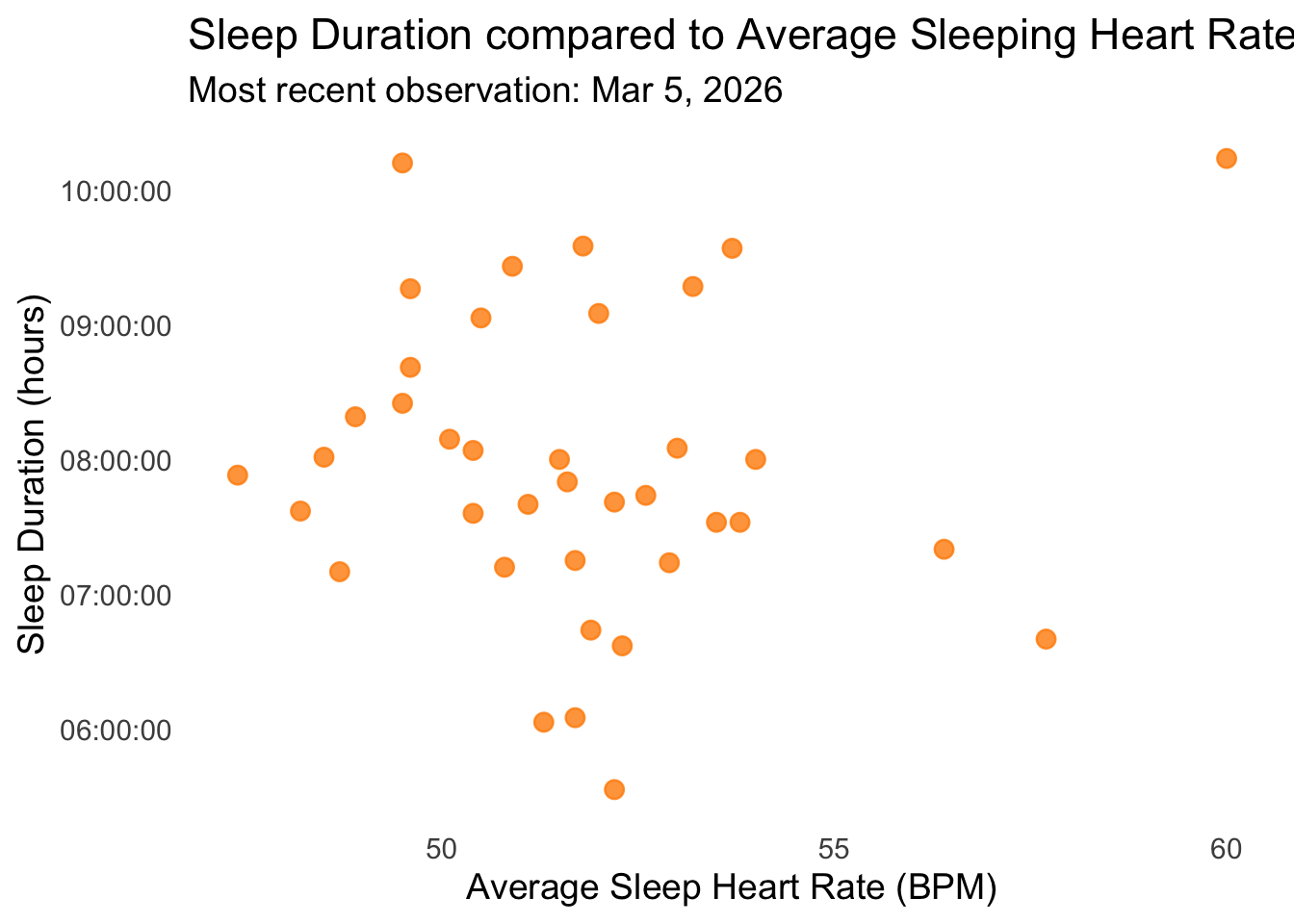 Figure 2: Sleep Duration vs Average Sleeping Heart Rate: This scatterplot illustrates nightly sleep duration (hours) in relation to average sleeping heart rate (BPM). Each point is a dark orange circle with moderate transparency, showing individual nights while minimizing overlap. The plot uses a minimal theme and the subtitle notes the most recent observation recorded on Thursday, March 5th, 2026. The visualization reveals variation in sleep duration across different heart rates, with nights of lower heart rate generally corresponding to slightly longer sleep duration.