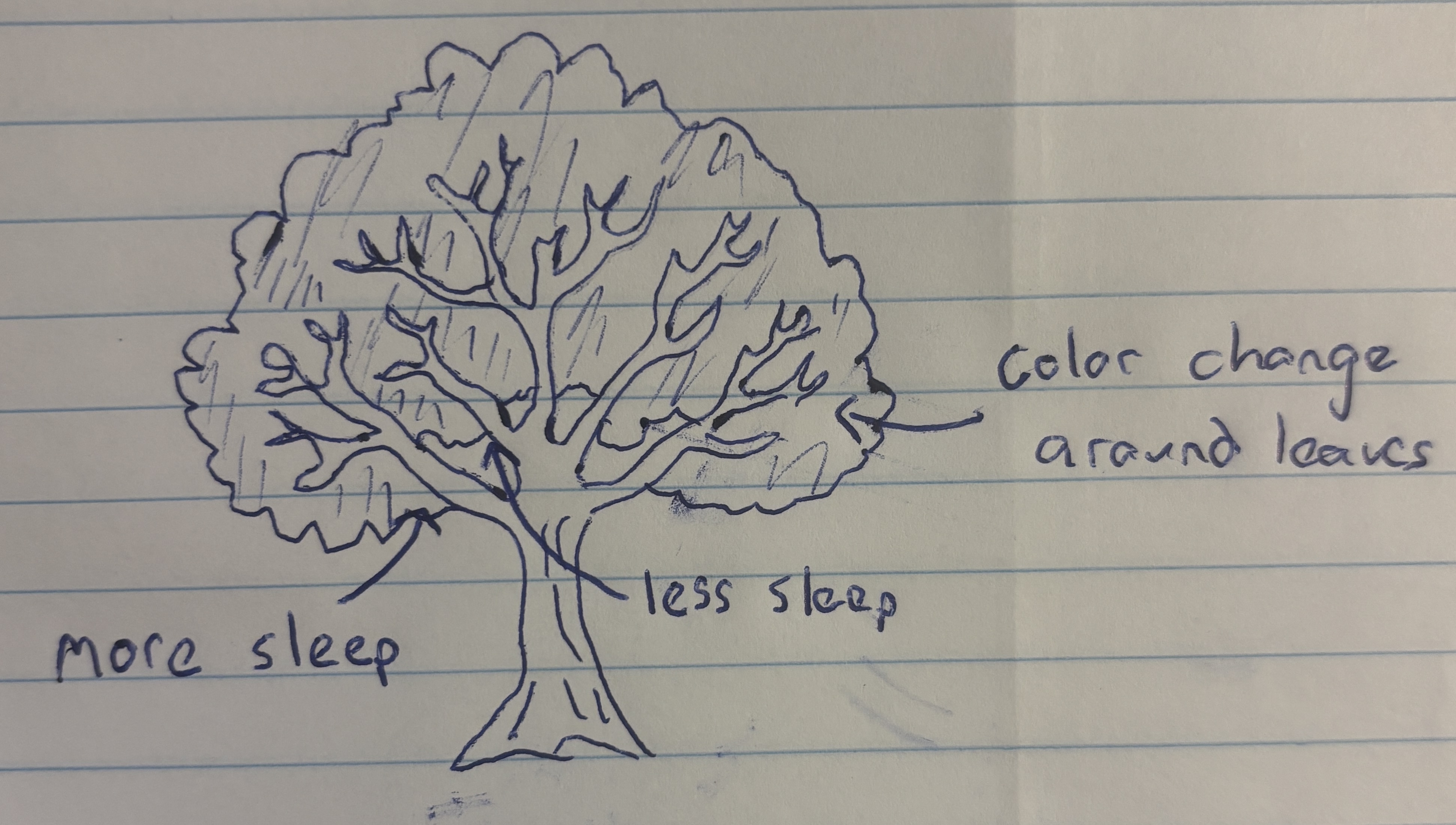 An affective visualization that could represent my personal data is a drawing of a tree. To represent my data I would divide the tree into two halves, with the left side representing the first half of the week and the right side representing the second half. Based on the duration of my sleep that night, the tree branch would be scaled to match. Additionally, the leaf color of each branch could be changed to match my average sleep heart rate, with greener leaves corresponding to a lower heart rate. As a result, a viewer could assess whether the tree is lopsided or symmetrical and identify the color of the tree leaves to see how side of the tree or leaf color impacted sleep duration.