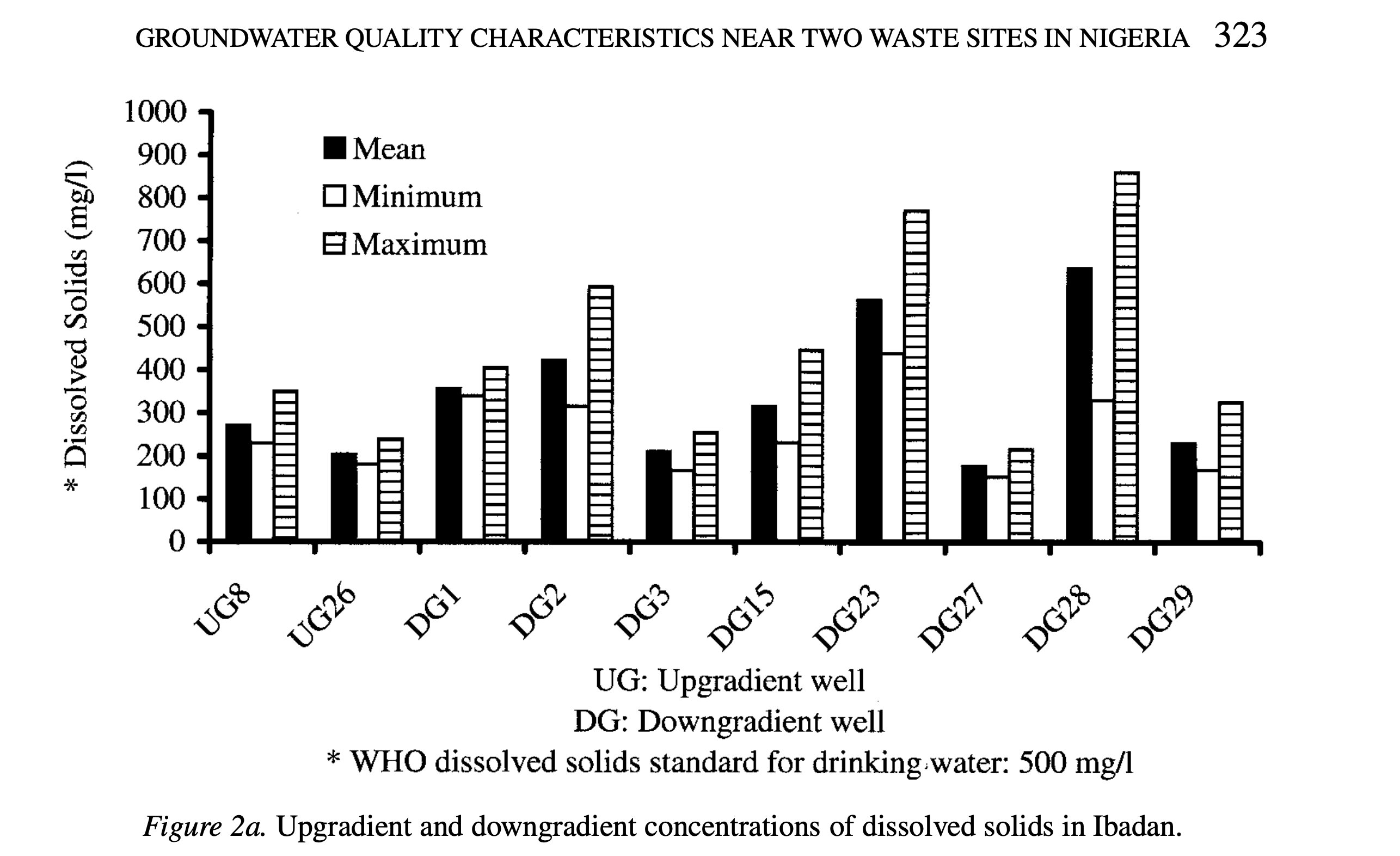 The table provided and examined in Part a of homework 1 somewhat clearly represents the data underlying tests. The figures logically place well locations on the x-axis and dissolved solids or chloride concentrations on the y-axis, making it easy to compare sites. By showing mean, minimum, and maximum values, the charts summarize the data and give a sense of variability, though the individual data points are not displayed. The use of separate bars for each statistic is clear but slightly busy, which could make interpretation harder at a glance. Overall, the figures represent the underlying statistics effectively, but including individual observations or error bars could improve clarity.
