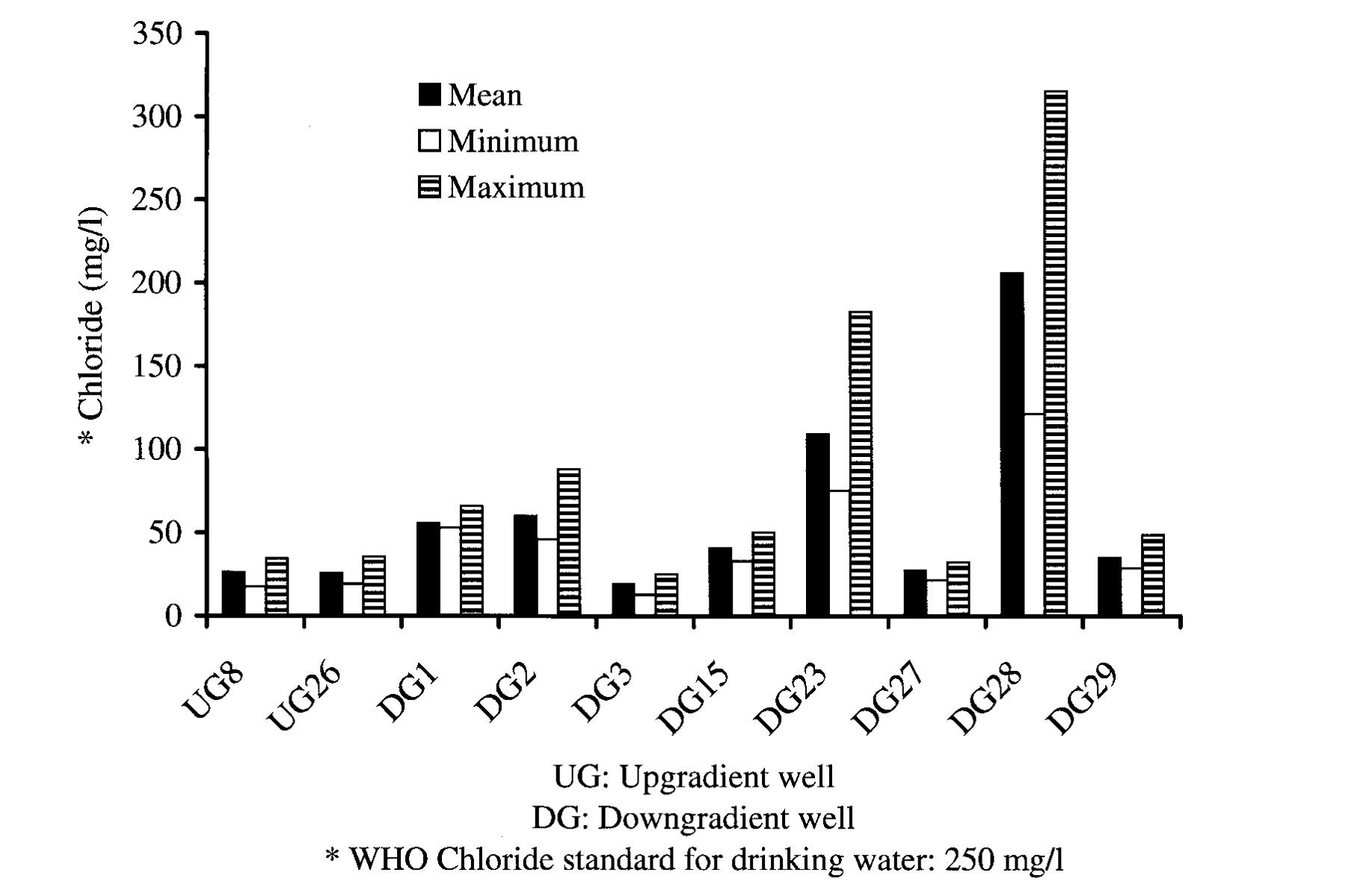 The figures are fairly clear, with the axes being well labeled with clean and distinct bars for mean, minimum, and maximum values. However, having these three bars grouped directly next to each other per location makes the chart appear cramped and busy, lowering the data:ink ratio. Overall, the important data is emphasized, but through simplifying the presentation by combining summary statistics or using different markers than the bars could improve the aesthetics, decrease visual clutter, and make the figure’s trends easier to identify.
