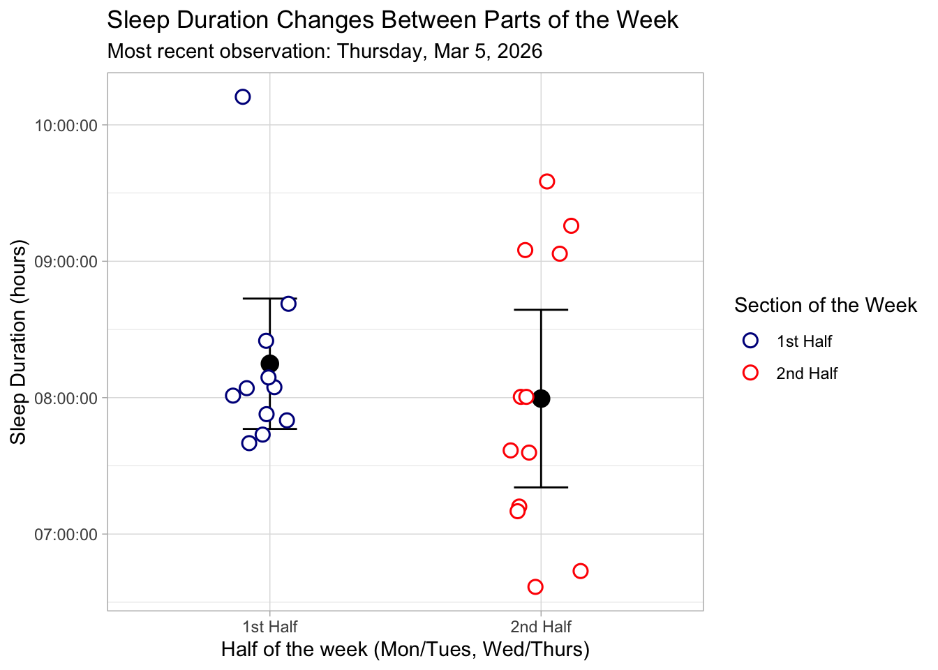 Figure 1. Sleep Duration Across the First and Second Halves of the Week. This figure displays individual sleep duration measurements (in hours) for the first half of the week (Monday/Tuesday) and the second half of the week (Wednesday/Thursday). Each data point is represented by a white-filled circle with a colored outline and slight horizontal jitter to prevent overlap. Points are colored by week section: dark blue for the first half and red for the second half. Black points indicate the mean sleep duration for each half of the week, with vertical black error bars representing the 95% confidence interval around the mean. The plot uses a light theme for readability, with labeled axes and a descriptive legend indicating the section of the week.