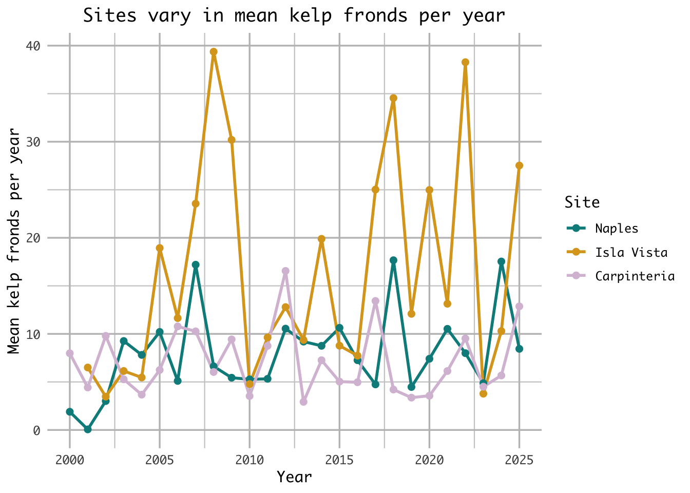 The site with the most variable mean kelp fronds per year is Isla Vista, as seen through its large fluctuations ranging from 4 to 40 mean kelp fronds per year. Additionally, Isla Vista’s fluctuation’s are more variable year over year than both Naples and Carpinteria with large increases and decreases in the mean kelp fronds as seen in years like 2006-2008 or 2022-2023.