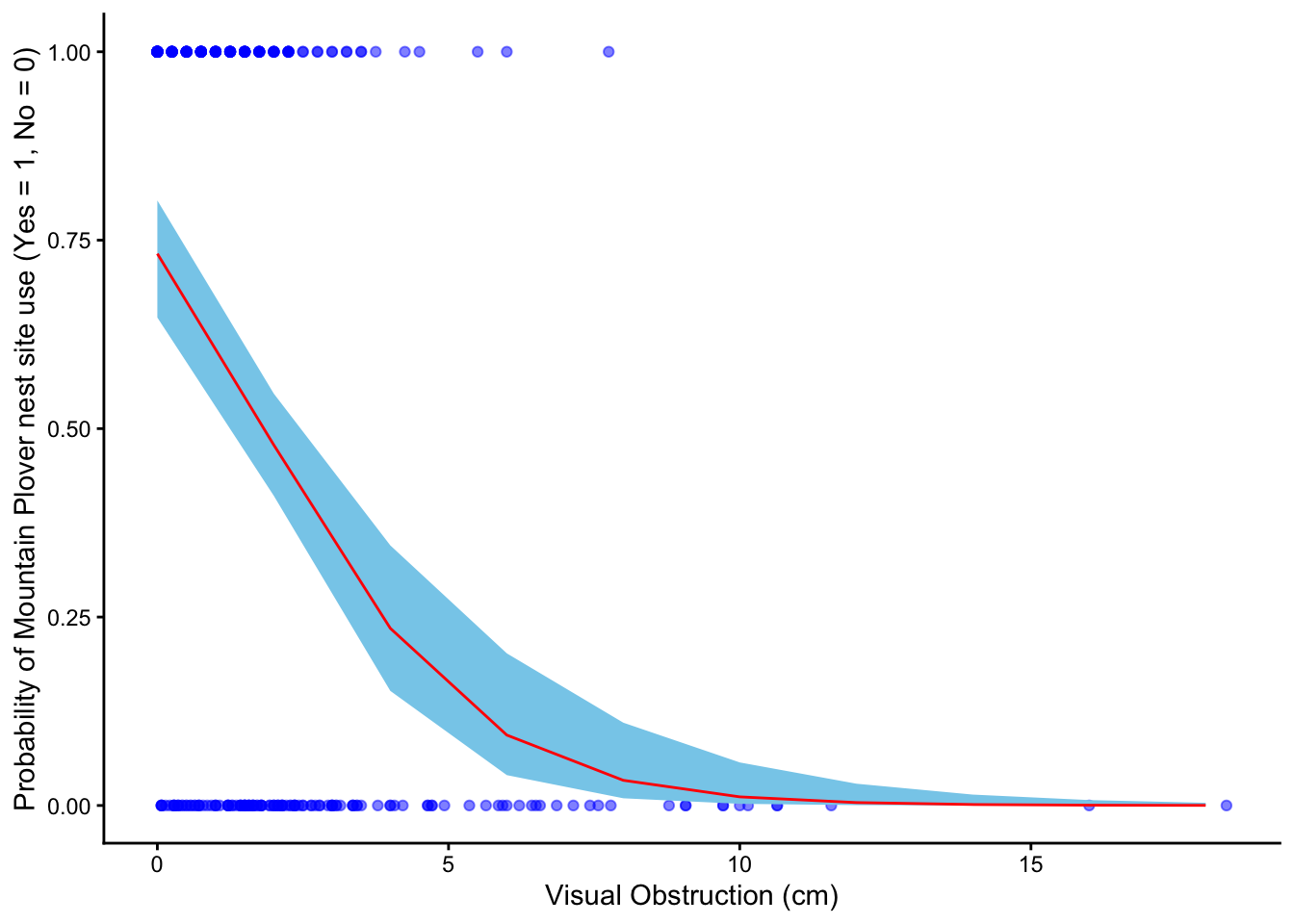 Figure 1 shows that the probability of Mountain Plover nest site use declines as visual obstruction increases, indicating that plovers prefer areas with more open ground. There is a clear negative relationship between vegetation height and the likelihood that a site will be used for nesting. When visual obstruction is zero, the predicted probability of a site being used for nesting is about 0.73. This pattern likely reflects the plovers’ need for unobstructed sight lines to detect predators and monitor their surroundings. Additionally, open areas may provide easier access to food and safer conditions for raising chicks, making sites with taller or denser vegetation less suitable for nesting.